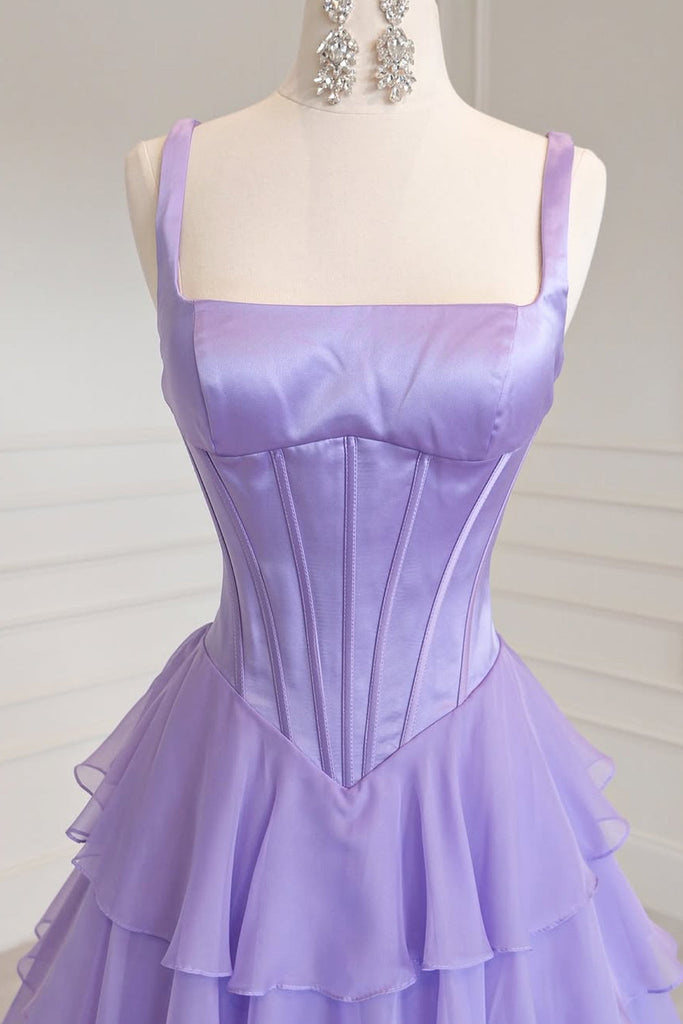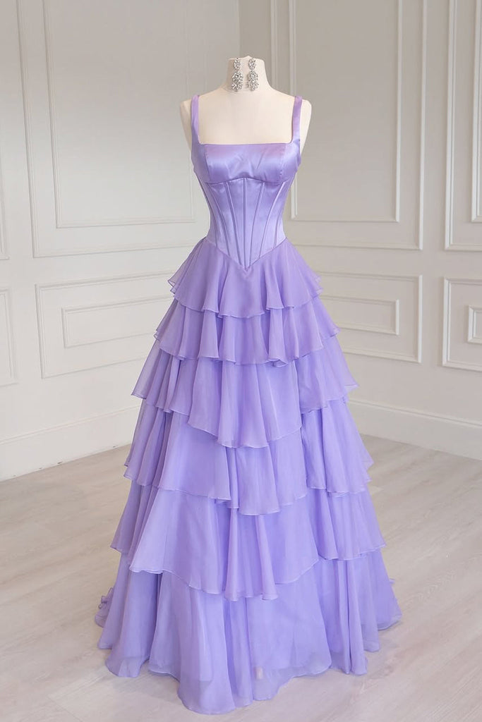 Cute A Line Square Neck Lavender Chiffon Tiered Prom Dress DM26011301