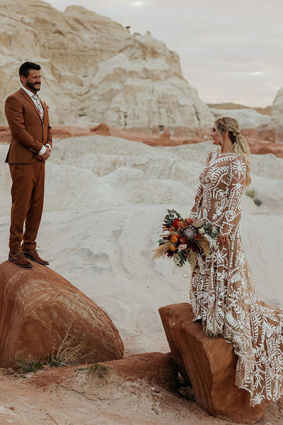 Exquisite Mermaid Long Sleeves Lace Wedding Dresses with Train DM24070704
