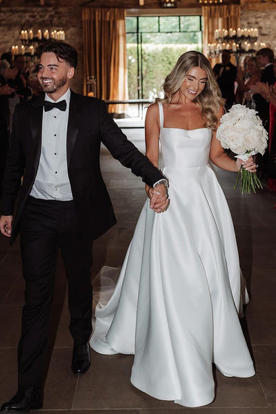 Fashion A Line Square Neck Satin Long Wedding Dresses with Slit DM24100503