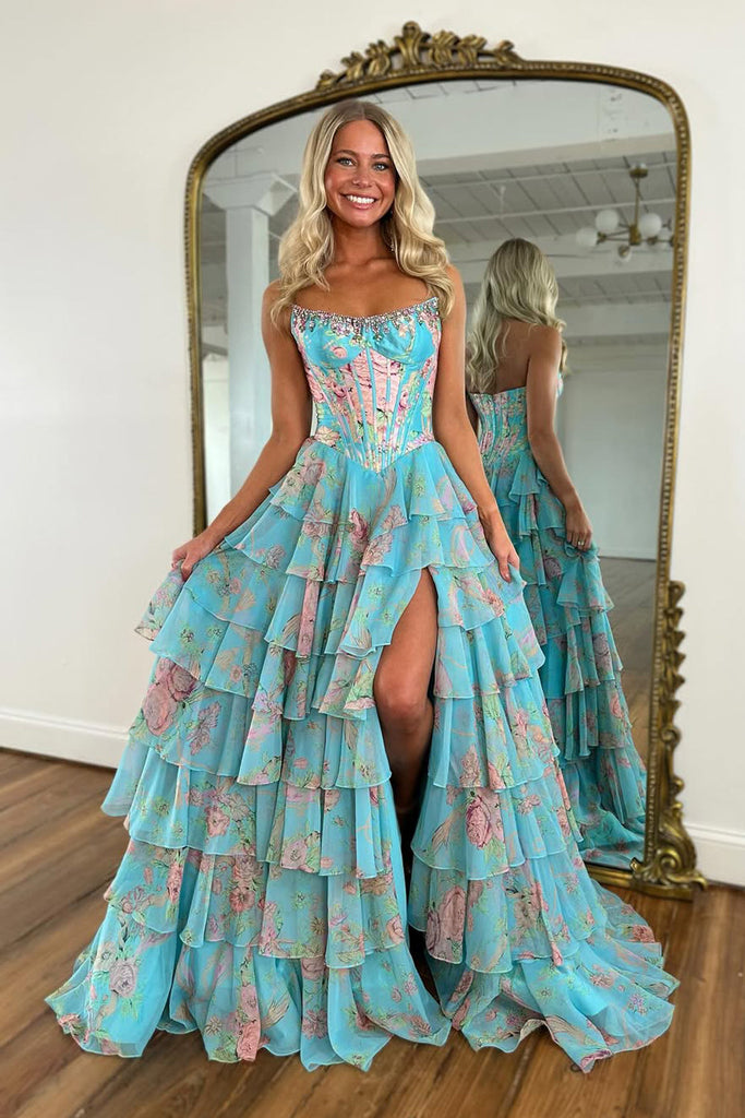 Gorgeous A Line Scoop Neck Tiered Chiffon Prom Dress with Beading DM52102902