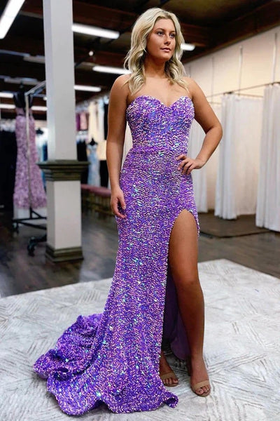 Mermaid Swetheart Purple Sequins Long Prom Dresses with Slit DM24071704