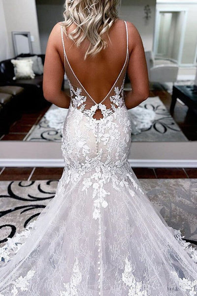 Romantic Mermaid V Neck Lace Long Wedding Dresses with Appliques DM24101909