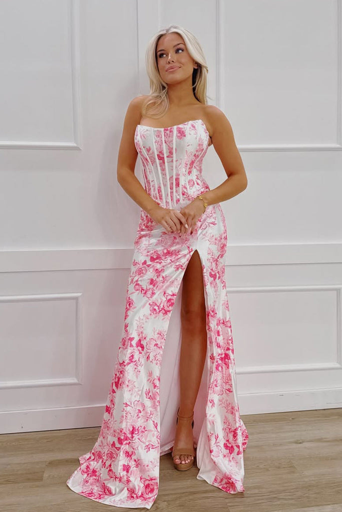 Sheath Merrmaid Strapless Floral Satin Slit Prom Dress DM26011206