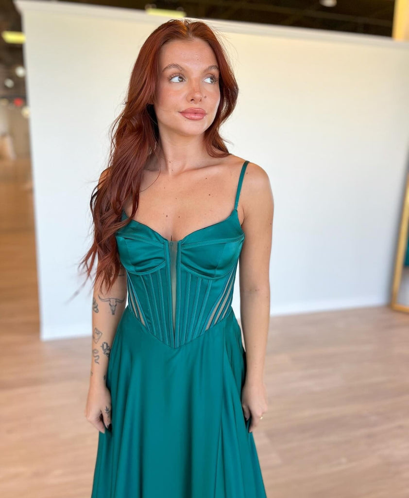 Simple A-Line Green Spaghetti Straps Satin Long Evening Dress Prom Dresses with Side Slit DM25101605