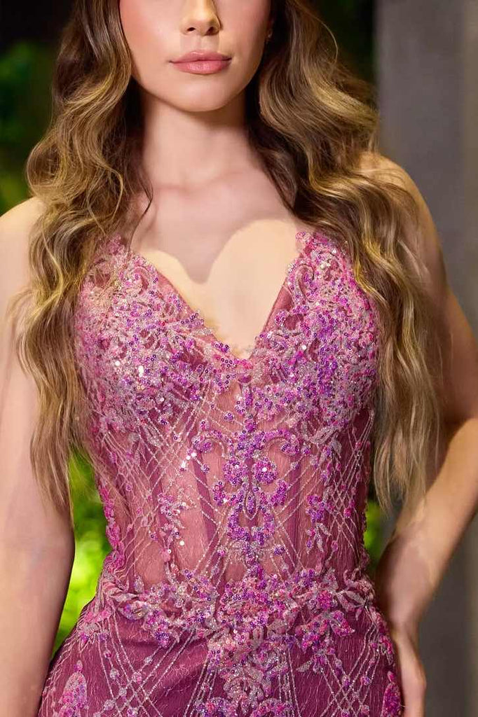 Stunning Purple V Neck Spaghetti Straps Appliques Mermaid Long Prom Dress DM25102801